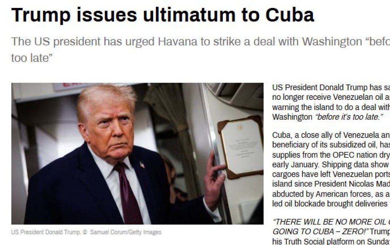ဒေါ်နယ်ထရမ့်က “ကျူးဘားနိုင်ငံအတွက် ဗင်နီဇွဲလားရေနံနဲ့ ငွေကြေးတွေ ထပ်ရှိလာတော့မှာ မဟုတ်ပါဘူး။ ကျူးဘားနိုင်ငံဟာ ဗင်နီဇွဲလားဆီကရတဲ့ရေနံ၊ ငွေကြေးတွေနဲ့ နှစ်ပေါင်းများစွာကြာအောင် ရပ်တည်နေခဲ့တာပါ။ အချိန်မလွန်ခင်မှာ သဘောတူညီချက်တစ်ခုပြုလုပ်ဖို့ ကျူးဘားကို ကျွန်တော်သတိပေးလိုပါတယ်” လို့ ပြောခဲ့ပါတယ်။