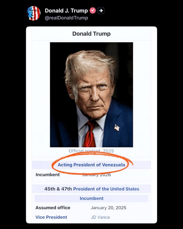 အမေရိကန်သမ္မတ ဒေါ်နယ်ထရမ့်သည် ဗင်နီဇွဲလားသမ္မတ နီကိုးလပ်စ် မာဒူရိုအား ဖမ်းဆီးခဲ့သည့် စစ်ဆင်ရေးအပြီး ရက်အနည်းငယ်အကြာ တနင်္ဂနွေနေ့ (ဇန်နဝါရီ ၁၁ ရက်) တွင် ၎င်းကိုယ်ကိုယ် "ဗင်နီဇွဲလားနိုင်ငံ၏ ယာယီသမ္မတ" အဖြစ် သရုပ်ဖော်ထားသည့် ဓာတ်ပုံတစ်ပုံကို လူမှုကွန်ရက်တွင် တင်ခဲ့သည်။