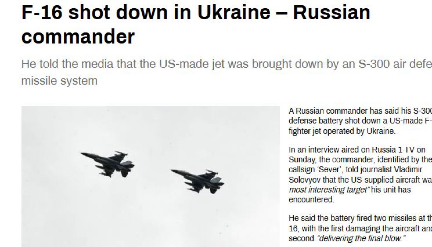 ရုရှားရဲ့ S-300 လေကြောင်းရန်ကာကွယ်ရေးစနစ်က ယူကရိန်းကအသုံးပြုနေတဲ့ အမေရိကန်ထုတ် F-16 တိုက်လေယာဉ်တစ်စင်းကို အောင်မြင်စွာပစ်ချနိုင်ခဲ့တယ်လို့ ရုရှားစစ်ဘက်က ထုတ်ပြန်ပြောကြားခဲ့ပါတယ်။ အမေရိကန်က ယူကရိန်းကို ထောက်ပံ့ပေးခဲ့တဲ့ F-16 တိုက်လေယာဉ်ဟာ ၎င်းရဲ့တပ်ဖွဲ့ရင်ဆိုင်ခဲ့ရတဲ့ စိတ်ဝင်စားဖွယ်အကောင်းဆုံးပစ်မှတ်တစ်ခုဖြစ်တယ်လို့ ရုရှားတပ်မှူး ဗလာဒီမာဆိုလိုဗိုရိုက ထုတ်ဖော်ပြောဆိုခဲ့ ပါတယ်။