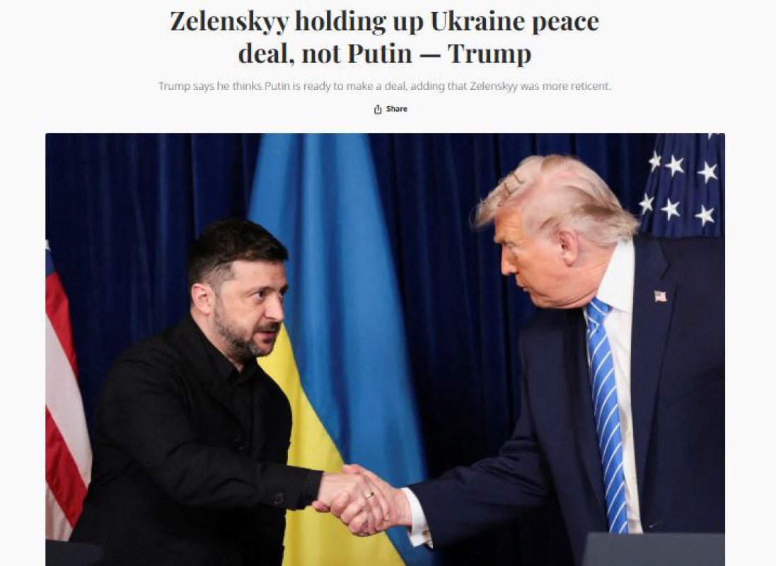 အလားအလာရှိတဲ့ ငြိမ်းချမ်းရေးသဘောတူညီချက်တစ်ခုကို ဆုပ်ကိုင်ထားတာက ရုရှားမဟုတ်ဘဲ ယူကရိန်းဖြစ် တယ်လို့ အမေရိကန်သမ္မတဒေါ်နယ်ထရမ့်က ပြောကြားခဲ့ပါတယ်။ ဒါ့ပြင် အချိန်(၄)နှစ်နီးပါးကြာအောင်ဖြစ်ပွား ခဲ့တဲ့ ရုရှား-ယူကရိန်းစစ်ပွဲကို အဆုံးသတ်ဖို့ ရုရှားသမ္မတပူတင်က အဆင်သင့်ဖြစ်နေပြီလို့ ထင်မိတယ်လို့လည်း ဒေါ်နယ်ထရမ့်က ပြောကြားခဲ့ပါတယ်။