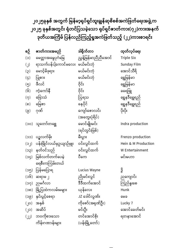 (၂၀၂၅) ခုႏွစ္ ျမန္မာ့႐ုပ္ရွင္ထူးခြၽန္ဆုအတြက္ (၂၂)ကားစာရင္း ထြက္ရွိလာ