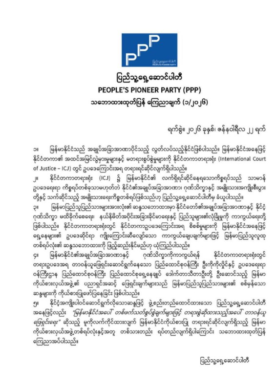 ICJ တြင္သြားေရာက္၍ ျမန္မာႏိုင္ငံကိုယ္စားျပဳ တရားရင္ဆိုင္လ်က္ရွိသည့္ ျမန္မာ ကိုယ္စားလွယ္အဖြဲ႕တစ္ရပ္လုံးႏွင့္အတူ တစ္သား တည္း ရပ္တည္ေၾကာာင္း ျပည္သူ႔ေရွ႕ေဆာင္ပါတီ(PPP)က ယေန႔ (ဇန္နဝါရီလ ၂၂ရက္)တြင္ သေဘာထားထုတ္ျပန္ထားေၾကာင္း သိရသည္။
