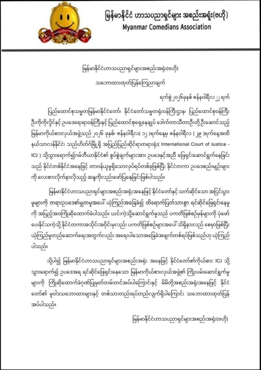 ICJ ေရာက္ ျမန္မာကိုယ္စားလွယ္အဖြဲ႕တစ္ႏွင့္အတူ ရပ္တည္ေၾကာင္း PPP ပါတီ ႏွင့္ ျမန္မာႏိုင္ငံ ဟာသပညာရွင္မ်ားအစည္းအ႐ုံး(ဗဟို)တို႔သေဘာထားထုတ္ျပန္