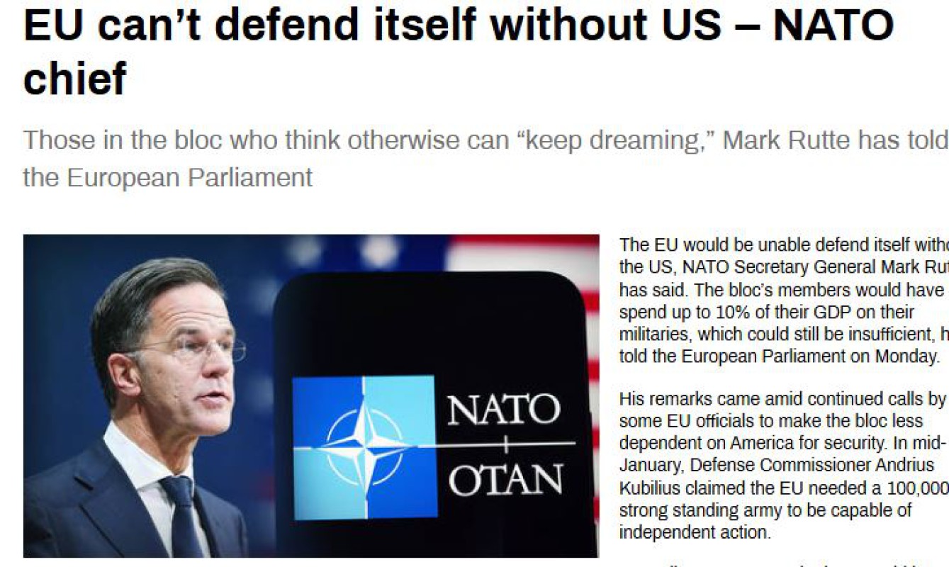 အမေရိကန်မပါဘဲ ဥရောပသမဂ္ဂက ကိုယ့်ကိုကိုယ်ခုခံကာကွယ်နိုင်မှာမဟုတ်ဘူးလို့ နေတိုးအဖွဲ့အထွေထွေ အတွင်းရေးမှူးချုပ် မာ့ခ်ရူတီက ပြောကြားခဲ့ပါတယ်။
