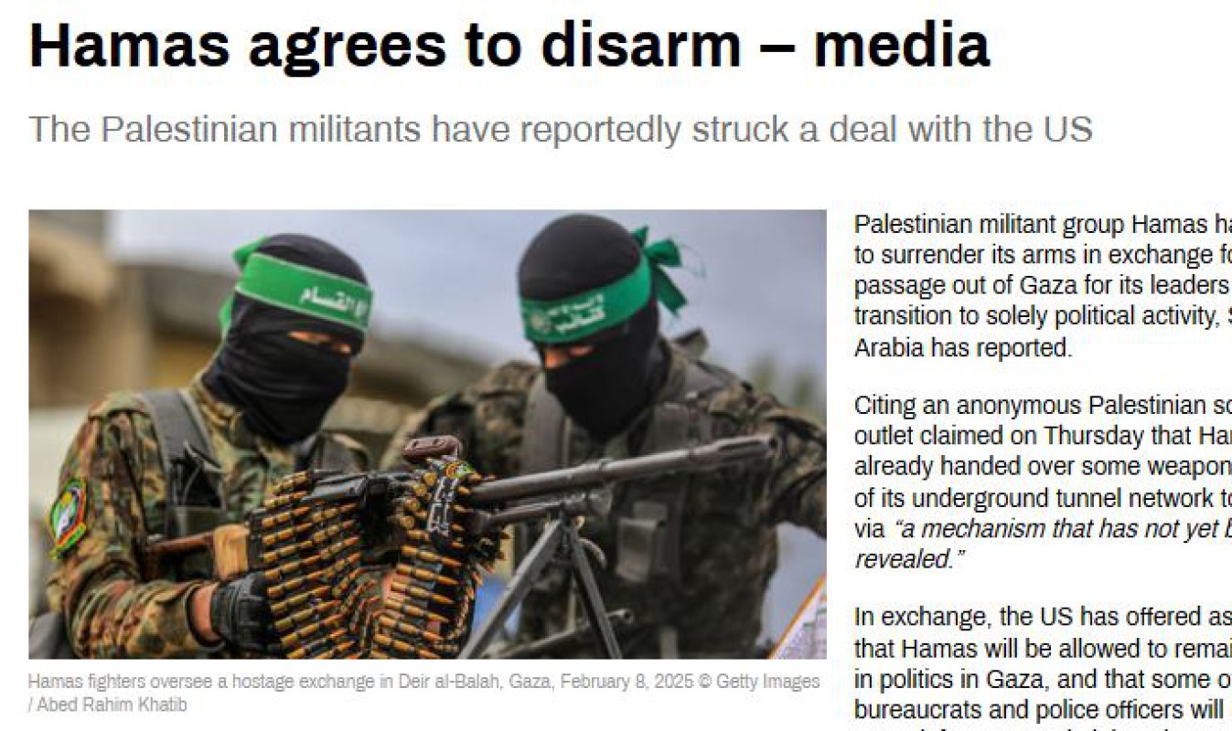 ပါလက်စတိုင်းလက်နက်ကိုင်အဖွဲ့ ဟားမက်စ်သည် လက်ရှိအချိန်တွင် လက်နက်စွန့်လွတ်ရန် သဘောတူညီခဲ့ ကြောင်း သိရသည်။ ဟားမက်စ် လက်နက်ကိုင်အဖွဲ့သည် ပြီးခဲ့သည့်ရက်ပိုင်းတွင် ၎င်းတို့လက်နက်များအချို့နှင့် မြေအောက်ဥမင်လိုဏ်ခေါင်း မြေပုံများကို အမေရိကန်အစိုးရထံ လွှဲပြောင်းပေးခဲ့သည်ဟု Sky News Arabia သတင်းဌာနက ဖော်ပြထားသည်။