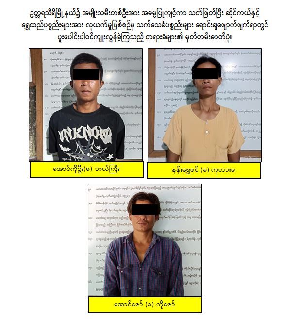 ထိုသို႔ေဆာင္႐ြက္ခဲ့ရာ စက္တင္ဘာလ (၁) ရက္ေန႔ ညပိုင္းတြင္ ဇမၺဴသီရိၿမိဳ႕နယ္အတြင္းရွိ ေဆာက္လုပ္ေရး လုပ္ငန္းခြင္တစ္ခုမွ ျပစ္မႈ က်ဴးလြန္ခဲ့သူမ်ားျဖစ္သည့္ ကဝၿမိဳ႕နယ္၊ အင္းေမာ္ေက်း႐ြာေန (၄၃)ႏွစ္အ႐ြယ္ သိန္းေဇာ္(ခ)ကိုသိန္းႏွင့္ ဒဂုံၿမိဳ႕သစ္ (ဆိပ္ကမ္း) ၿမိဳ႕နယ္၊ အမွတ္(၆၇)ရပ္ကြက္ေန အသက္ (၂၃) ႏွစ္အ႐ြယ္ ေသာင္းဝင္းေအာင္ (ခ) ခ်စ္ဖူး၊ ဒကၡိဏသီရိၿမိဳ႕နယ္၊ စိုက္ခင္း(၃)ေက်း႐ြာေန အသက္ (၂၇)ႏွစ္အ႐ြယ္ ေအာင္ကိုဦး (ခ) ဘယ္ႀကီး၊ ကဝၿမိဳ႕နယ္၊ ဝါးေတာေက်း႐ြာေန အသက္ (၄၂) ႏွစ္အ႐ြယ္ နန္းေ႐ႊစင္ (ခ) ကုလားမ တို႔ကို ေပ်ာက္ဆုံးေနသည့္ CANDA 110 ဆိုင္ကယ္ တစ္စီးႏွင့္အတူ ဖမ္းဆီးရမိခဲ့ေၾကာင္း သိရသည္။