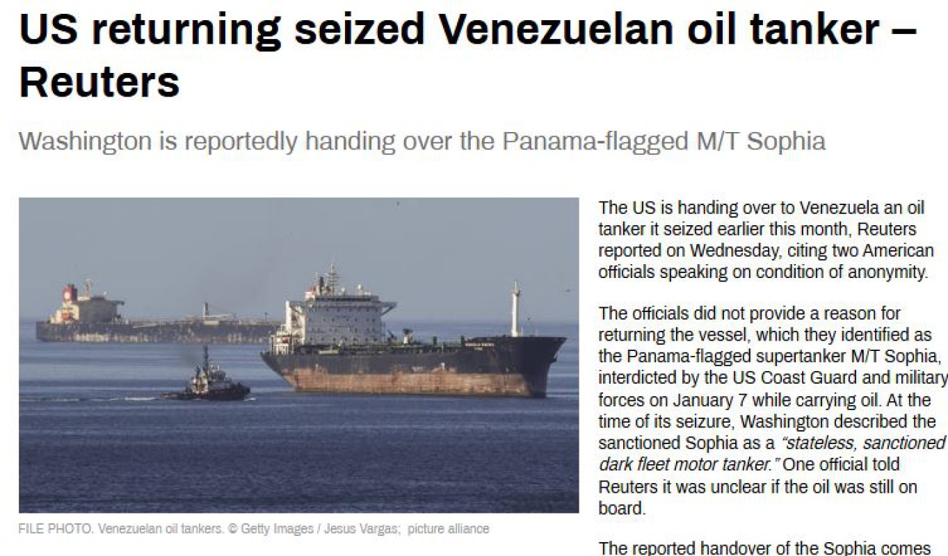 ယခုလအစောပိုင်းမှာ ဖမ်းဆီးထိန်းသိမ်းခဲ့တဲ့ ရေနံတင်သင်္ဘောတစ်စီးကို အမေရိကန်က ဗင်နီဇွဲလားကို လွှဲပြောင်းပေးခဲ့တယ်လို့ အမည်မဖော်လိုတဲ့အမေရိကန်အရာရှိနှစ်ဦးရဲ့ပြောဆိုချက်တွေကို ကိုးကားပြီး ရိုက်တာသတင်းဌာနက ရေးသားဖော်ပြခဲ့ပါတယ်။