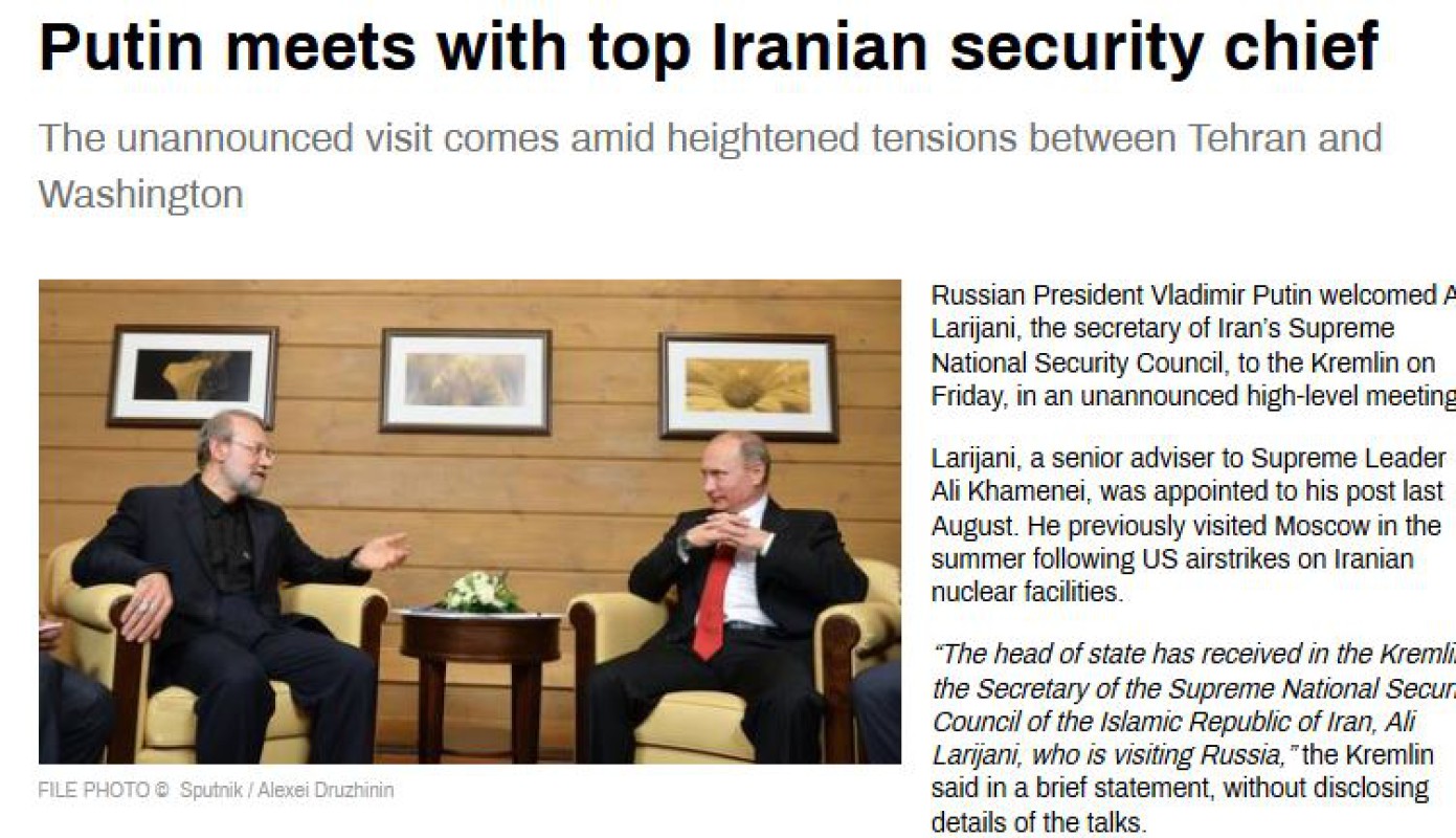 အမေရိကန်နဲ့အီရန်ကြား တင်းမာမှုတွေမြင့်တက်နေချိန်မှာပဲ ရုရှားသမ္မတပူတင်နဲ့ အီရန်ရဲ့အမြင့်ဆုံး အမျိုးသား လုံခြုံရေးကောင်စီအတွင်းရေးမှူး အလီလာရီ ဂျာနီတို့ရဲ့ တွေ့ဆုံမှုထွက်ပေါ်လာတာပဲဖြစ်ပါတယ်။