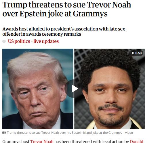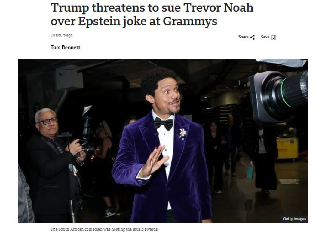 မကြာသေးမီက ကျင်းပပြီးစီးသွားတဲ့ Grammys ဆုပေးပွဲကြီးမှာ အစီအစဉ်မှူးရဲ့နောက်ပြောင်မှုတစ်ခုက သမ္မတ ဒေါနယ်ထရမ့်ကို အကြီးအကျယ် ဒေါသထွက်စေခဲ့တယ်လို့ သတင်များထွက်နေပါတယ်။ အစီအစဥ်မှူး Trevor Noah က Trump ကို Jeffrey Epstein ရဲ့ကျွန်းမှာ အချိန်ဖြုန်းခဲ့တယ်ဆိုပြီး စနောက်ခဲ့တာနဲ့ပတ်သက်လို့ သတင်းထောက်တစ်ဦးရဲ့မေးမြန်းမှုကို အမေရိကန်သမ္မတက ပြင်းပြင်းထန်ထန်တုံ့ပြန်ခဲ့တာဖြစ်ပါတယ်။