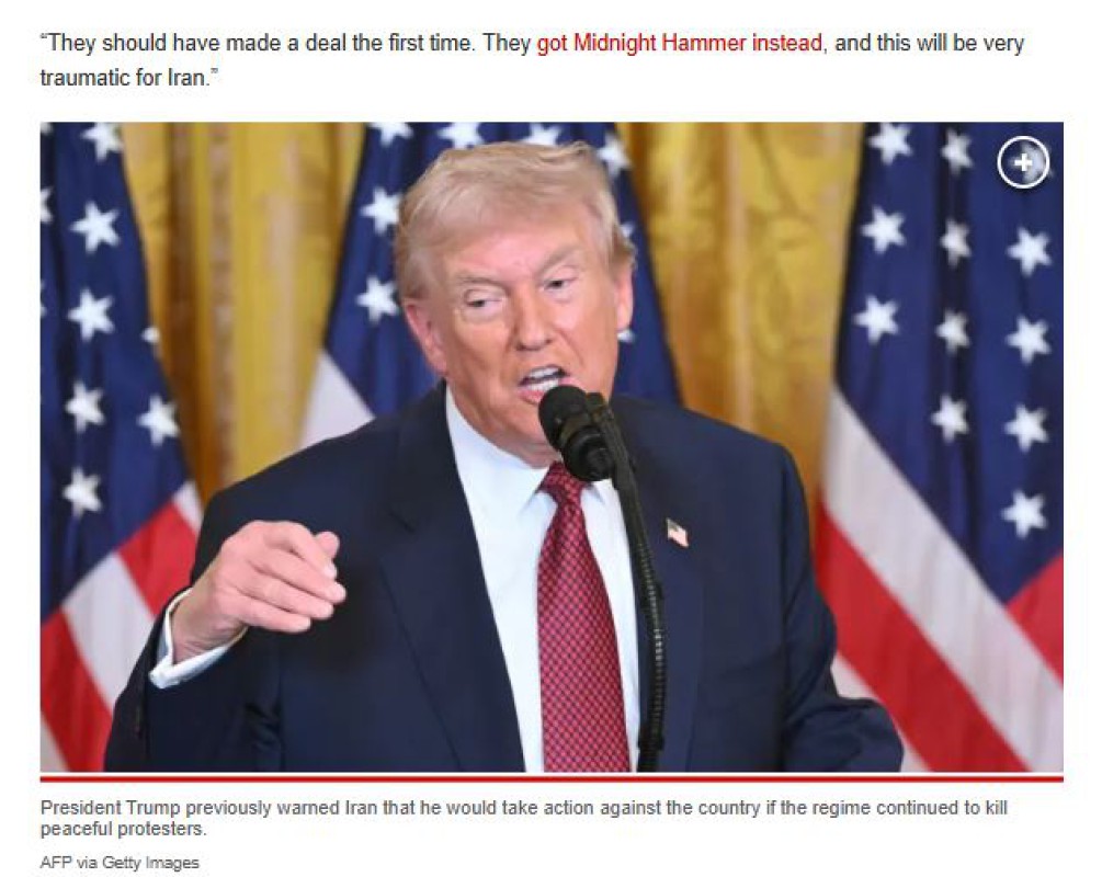 သမ္မတထရမ့်က အီရန်ခေါင်းဆောင်များသည် ပထမအကြိမ်ကတည်းက သဘောတူညီမှုရယူသင့်ခဲ့ကြောင်း၊ ထိုသို့မလုပ်ဆောင်ခဲ့သည့်အတွက် "Midnight Hammer" စစ်ဆင်ရေးနှင့်ကြုံတွေ့ခဲ့ရကြောင်း ပြန်ပြောင်း ပြောကြားခဲ့သည်။