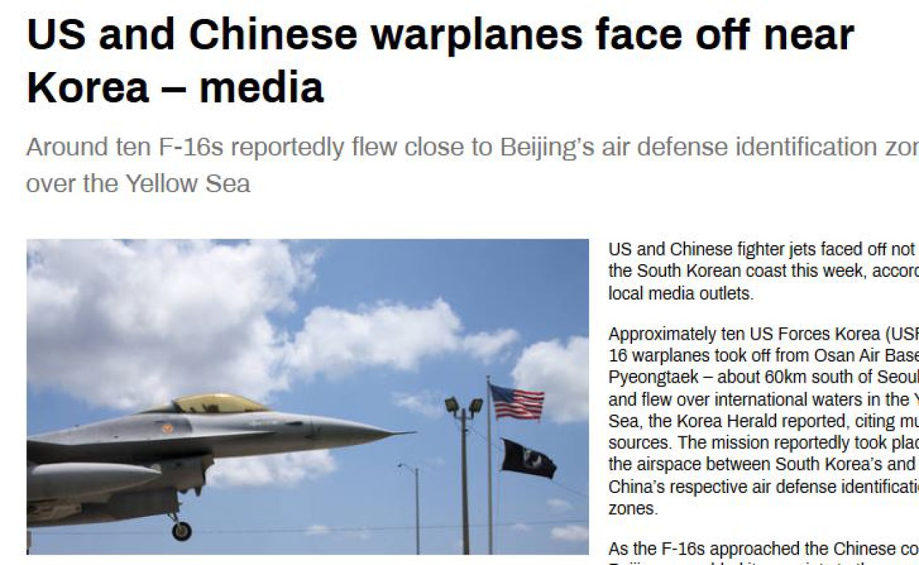 ယခုသီတင်းပတ်အတွင်း အမေရိကန်နဲ့တရုတ်တို့ရဲ့ တိုက်လေယာဉ်တွေဟာ တောင်ကိုရီးယားကမ်းရိုးတန်းအနီးမှာ ထိပ်တိုက်တွေ့ဆုံမှုတွေဖြစ်ပွားခဲ့တယ်လို့ သိရပါတယ်။ ဆိုးလ်မြို့တောင်ဘက် (၆ဝ) ကီလိုမီတာအကွာမှာရှိတဲ့ Pyeongtaek မြို့ အိုဆန်လေတပ်စခန်းကနေ ပျံတက်လာတဲ့ F-16 တိုက်လေယာဉ်(၁ဝ)စီးခန့်ဟာ ပင်လယ်ဝါမှာ ရှိတဲ့ နိုင်ငံတကာရေပြင်ပေါ်မှာ ပျံသန်းမှုတွေလုပ်ဆောင်ခဲ့တာဖြစ်တယ်လို့ Korea Herald သတင်းစာက ရေးသားဖော်ပြခဲ့ပါတယ်။
