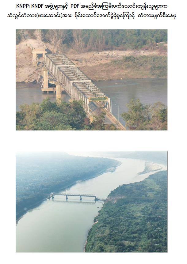 The Thanlwin Bridge (Hpasawng), located near Hpasawng Town in Mese Township, Kayah State, was destroyed by landmines detonated by KNPP, KNDF, and PDF groups, according to the State Security and Peace Commission’s Information Team.
