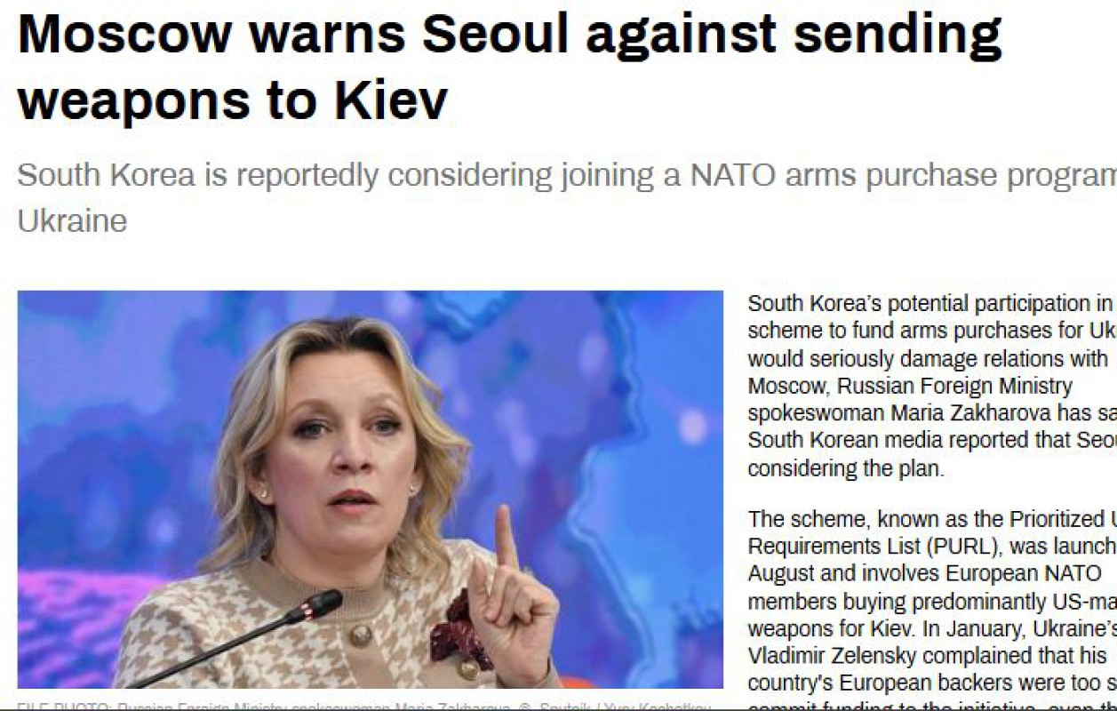ယူကရိန်းအတွက် စစ်လက်နက်ပစ္စည်းဝယ်ယူရာမှာ ရန်ပုံငွေထောက်ပံ့ပေးဖို့ နေတိုးအဖွဲ့ရဲ့ အစီအစဉ်မှာ တောင်ကိုရီးယား ရဲ့အလားအလာရှိတဲ့ပါဝင်နိုင်ခြေက ရုရှားနဲ့ဆက်ဆံရေးကို ပြင်းပြင်းထန်ထန် ထိခိုက်စေနိုင် တယ်လို့ ရုရှားနိုင်ငံခြားရေးဝန်ကြီးဌာန ပြောရေးဆိုခွင့်ရှိသူ မာရီယာဇာခါရိုဗာ်က သတိပေးပြောဆိုခဲ့ပါတယ်။