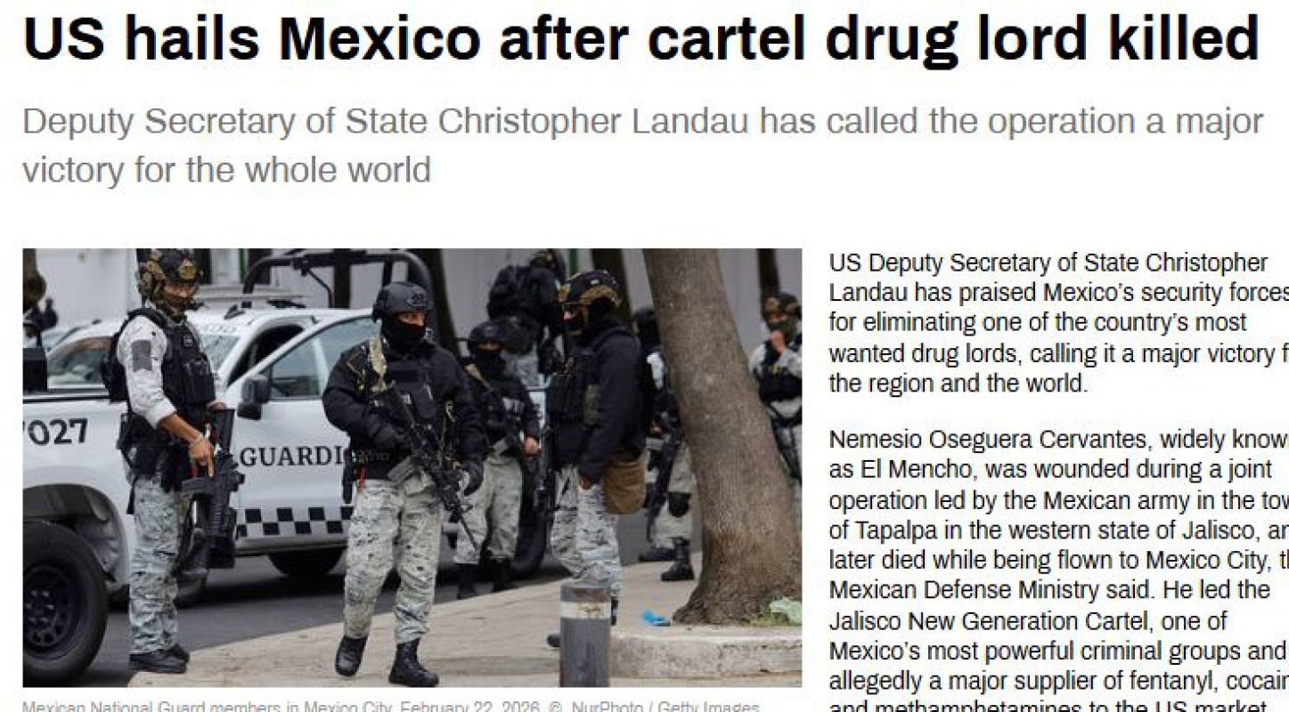 ခရစ္စတိုဖာလန်ဒေါက “မက္ကဆီကိုတပ်ဖွဲ့တွေဟာ သွေးထွက်သံယိုမှုအများဆုံးနဲ့ ရက်စက်အကြမ်းကြုတ်ဆုံး မူးယစ်ဆေးဝါးဘုရင်တွေထဲက တစ်ယောက်ဖြစ်တဲ့ အယ်လ်မန်ချိုကို သတ်ပစ်လိုက်တယ်ဆိုတဲ့သတင်းတွေကို ကြား သိရပါတယ်။ ဒါက မက္ကဆီကို၊ အမေရိကန် နဲ့ လက်တင်အမေရိကနဲ့ ကမ္ဘာကြီးအတွက် တကယ်ကို ကောင်းမွန်တဲ့ဖွံ့ဖြိုးတိုးတက်မှုတစ်ခုပဲဖြစ်ပါတယ်” လို့ ပြောခဲ့ပါတယ်။