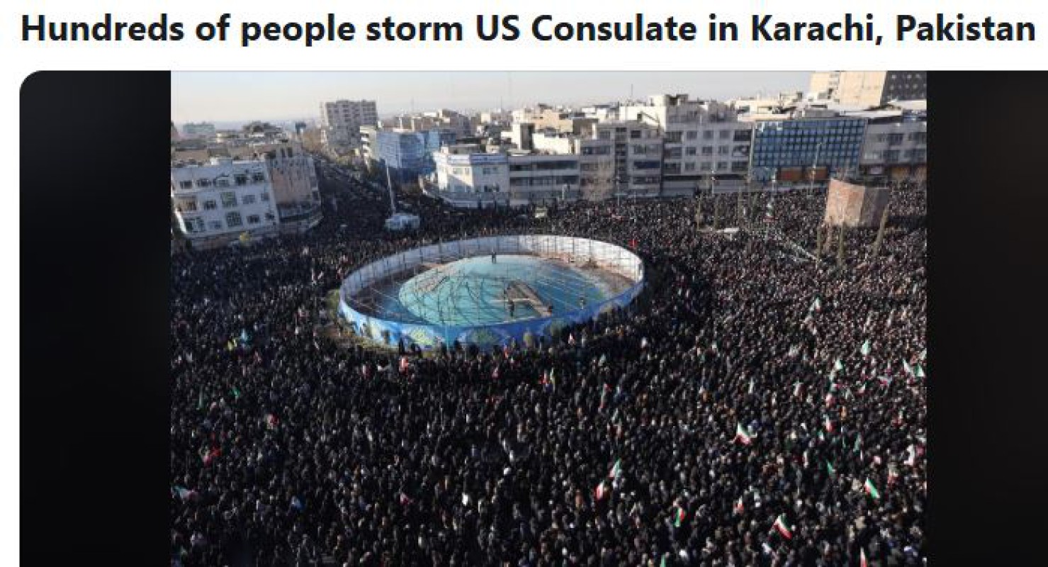 အီရန္အျမင့္ဆုံးေခါင္းေဆာင္ အာယတိုလာ အလီခါေမနီ ႏွင့္ စစ္ဦးစီးခ်ဳပ္တို႔ ေသဆုံးမူကိုဆန႔္က်င္မူအျဖစ္ ပါကစၥတန္ႏိုင္ငံ၊ ကရာခ်ီၿမိဳ႕ရွိ အေမရိကန္ေကာင္စစ္ဝန္႐ုံးကို ေဒါသထြက္ေနေသာ လူအုပ္ႀကီးက မတ္လ ၁ ရက္တြင္ အတင္းအဓမၼ ဝင္ေရာက္စီးနင္းၿပီး အေဆာက္အအုံ၏ အစိတ္အပိုင္းအခ်ိဳ႕ကို မီးရႈိ႕ဖ်က္ဆီးခဲ့ေၾကာင္း သိရသည္။