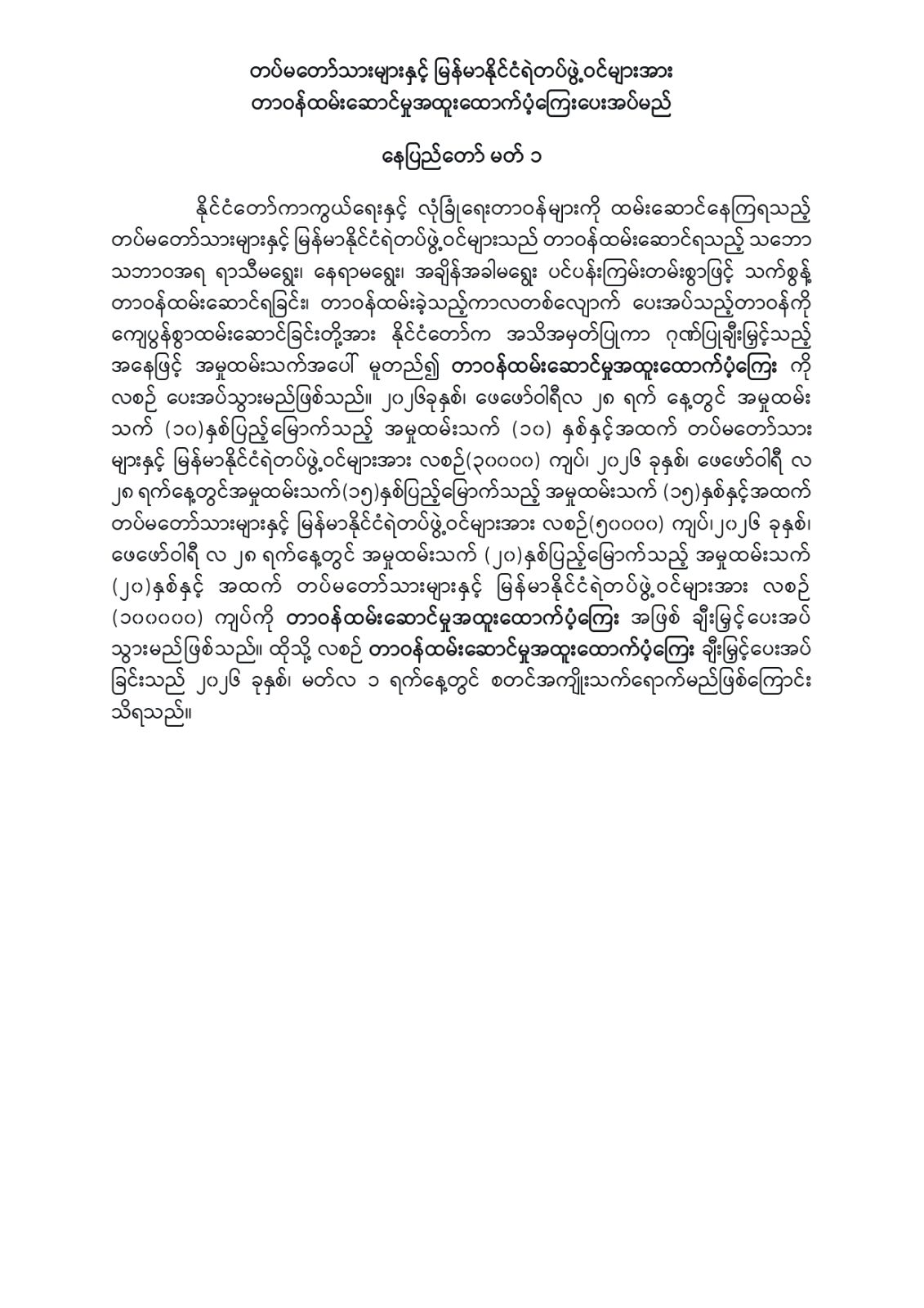 အမှုထမ်းကာလ ၁၀ နှစ်၊ ၁၅ နှစ် နှင့် နှစ် ၂၀ ရှိ တပ်မတော်သားများ နှင့် ရဲတပ်ဖွဲ့ဝင်များအား တာဝန်ထမ်းဆောင်မှု အထူးထောက်ပံ့ကြေးပေးမည်