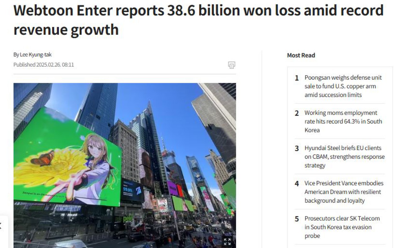 ကမာၻေက်ာ္ ဒစ္ဂ်စ္တယ္ကာတြန္းလုပ္ငန္းစုႀကီးျဖစ္တဲ့ Webtoon Entertainment ဟာ ၂၀၂၅ ခုႏွစ္အတြက္ ႏွစ္ပတ္လည္ ဝင္ေငြ အေမရိကန္ေဒၚလာ ၂ ဘီလီယံနီးပါးအထိ စံခ်ိန္တင္ ရရွိခဲ့ေပမယ့္ လုပ္ငန္းလည္ပတ္မႈပိုင္းမွာ ေဒၚလာ ၉၀၂ သန္းခန႔္ အရႈံးေပၚခဲ့တယ္လို႔ ထုတ္ျပန္ေၾကညာခဲ့ပါတယ္။