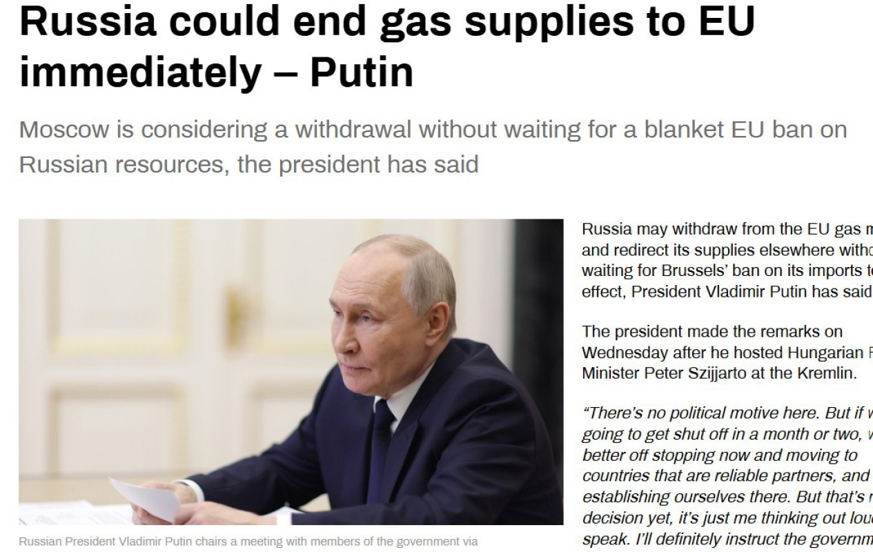 လက်ရှိအချိန်တွင် ဥရောပသမဂ္ဂက ကြုံတွေ့နေရသော စွမ်းအင်အကျပ်အတည်းသည် နှစ်ပေါင်းများစွာကြာအောင် ဥရောပသမဂ္ဂ၏အာဏာပိုင်များက လိုက်စားခဲ့သည့် မှားယွင်းသောမူဝါဒများ၏ ရလဒ်ဖြစ်ကြောင်း ပူတင်က မှတ်ချက်ပြောခဲ့သည်။
