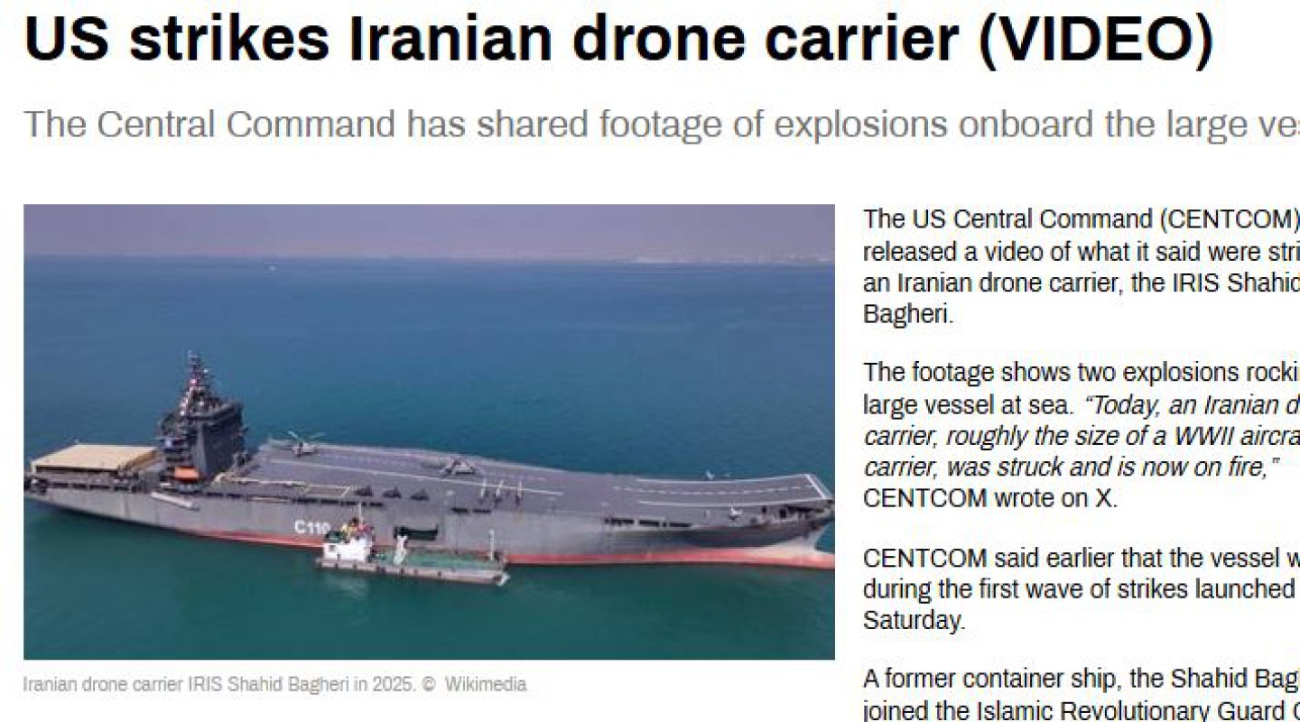 (CENTCOM) က “ဒုတိယကမ္ဘာစစ်လေယာဉ်တင်သင်္ဘောအရွယ်အစားခန့်ရှိတဲ့ အီရန်ဒရုန်းတင်သင်္ဘောတစ်စီးကို ထိရောက်တဲ့တိုက်ခိုက်မှုတွေလုပ်ဆောင်ခဲ့ပါတယ်” လို့ ရေးသားဖော်ပြခဲ့ပါတယ်။