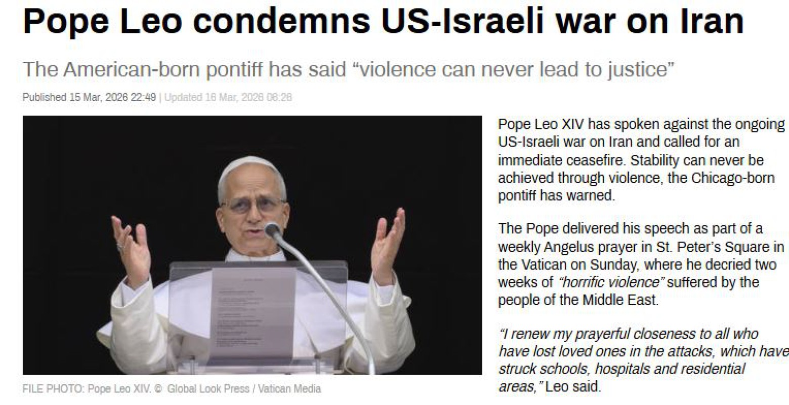 အီရန်အပေါ်ဆက်လက်လုပ်ဆောင်နေတဲ့ အမေရိကန်-အစ္စရေးစစ်ပွဲကို ပုပ်ရဟန်းမင်းကြီး Leo XIV က ပြစ်တင် ရှုတ်ချခဲ့ပြီး ချက်ချင်းအပစ်အခတ်ရပ်စဲဖို့ တောင်းဆိုခဲ့တယ်လို့ သိရပါတယ်။ ဒါ့ပြင် အကြမ်းဖက်မှုတွေအားလုံးက တည်ငြိမ်မှုကို ဘယ်တော့မှ ရရှိစေလိမ့်မှာမဟုတ်ဘူးလို့လည်း Leo XIV က သတိပေးပြောဆိုခဲ့ပါတယ်။ ပုပ်ရဟန်း မင်းကြီး Leo XIV ဟာ ဗာတီကန်မှာရှိတဲ့ စိန့်ပီတာရင်ပြင်မှာ မိန့်ခွန်းပြောကြားစဉ်အချိန်အတွင်း ယခုလို ထုတ်ဖော် ပြောဆိုခဲ့တာလည်း ဖြစ်ပါတယ်။