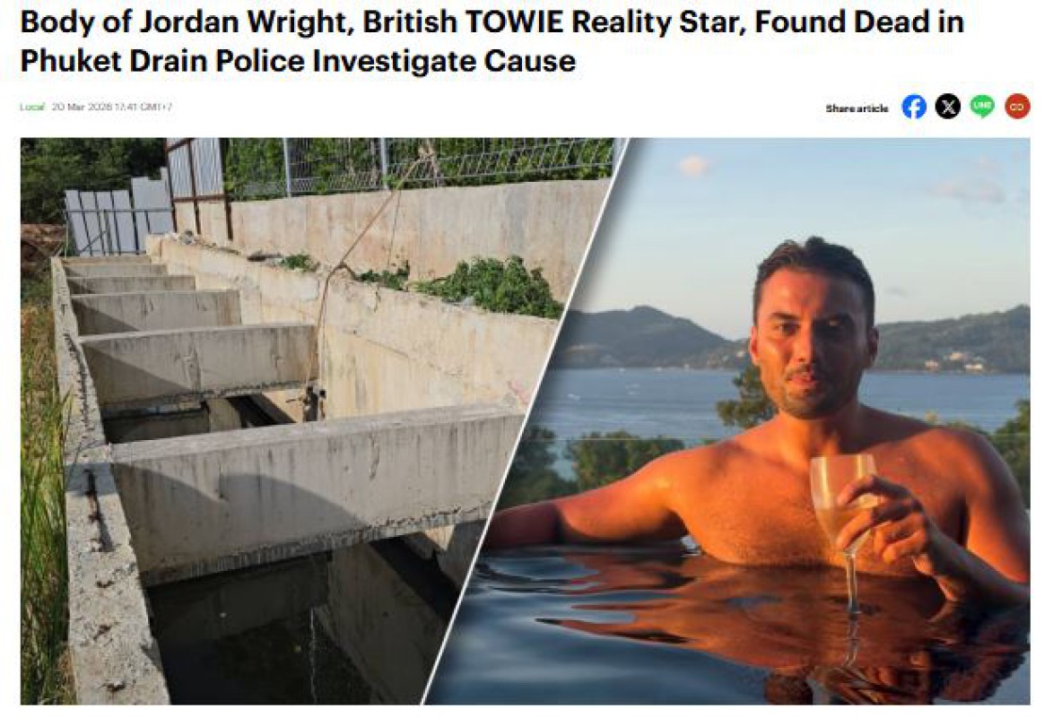 ဗြိတိန် နာမည်ကြီး Reality Show တစ်ခုဖြစ်တဲ့ "The Only Way Is Essex" (TOWIE) မှာ ပါဝင်ခဲ့ဖူးသူ အသက် ၃၂ နှစ်အရွယ် ဂျော်ဒန်ရိုက် အမည်ရှိ ဗြိတိန်ရုပ်သံကြယ်ပွင့်ဟာ ထိုင်းနိုင်ငံ၊ ဖူးခက်ရှိ ဟိုတယ်တစ်ခုအနီး ရေနုတ်မြောင်းအတွင်း သေဆုံးနေတာကို တွေ့ရှိခဲ့ရတယ်လို့ ထိုင်းရဲတပ်ဖွဲ့က အတည်ပြုပြောကြားခဲ့ပါတယ်။