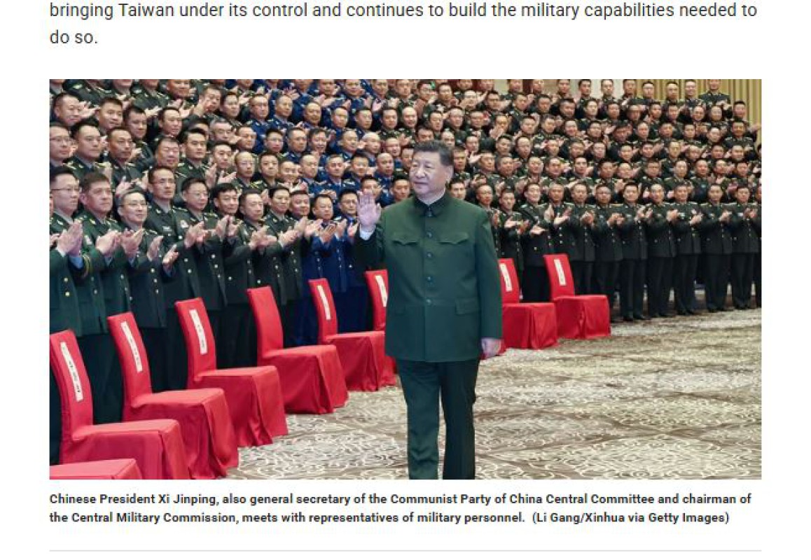တရုတ်နိုင်ငံသည် (၂၀၂၇)ခုနှစ်တွင် တရုတ်(တိုင်ပေ)ကျွန်းကို ကျူးကျော်မှုများ လုပ်ဆောင်ရန် အစီအစဉ်များ မရှိသော်လည်း အင်အားသုံးခြင်းမျိုးမရှိဘဲ တရုတ်(တိုင်ပေ)ကျွန်းကို ထိန်းချုပ်နိုင်ရန် ကြိုးပမ်းနေကြောင်း အမေရိ ကန်၏ နှစ်ပတ်လည်ထောက်လှမ်းရေးအစီရင်ခံစာတွင် ရေးသားဖော် ပြထားသည်။ အမေရိကန်၏ နှစ်ပတ်လည် ထောက်လှမ်းရေးအစီရင်ခံစာက ယင်းကဲ့သို့စွပ်စွဲဖော်ပြထားမှုကို တရုတ်အစိုးရက ပြင်းပြင်းထန်ထန် ဆန့်ကျင်ကန့် ကွက်ခဲ့ကြောင်းလည်းသိရသည်။