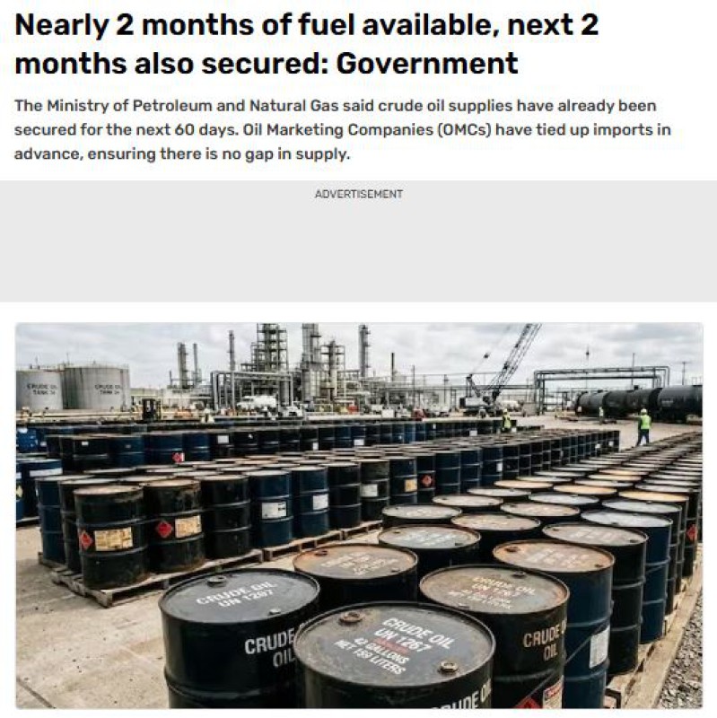 လာမည့္ ရက္ေပါင္း(၆၀)အတြက္ ေရနံစိမ္းေထာက္ပံ့မႈမ်ားကို ရရွိထားၿပီဟု အိႏၵိယေရနံဝန္ႀကီးဌာနေျပာ