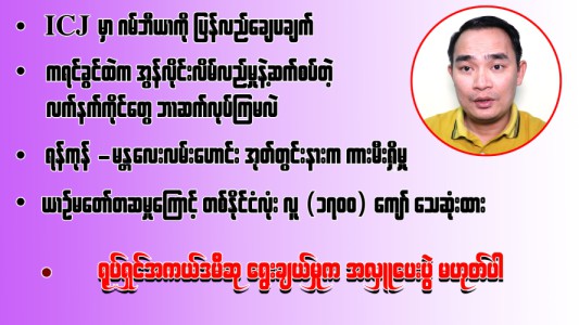 ICJ မှာ ဂမ်ဘီယာကို ပြန်လည်ချေပချက်၊ ရန်ကုန် -မန္တလေးလမ်းဟောင်း အုတ်တွင်းနားက ကားမီးရှို့မှု၊ ကရင်ခွင်ထဲက အွန်လိုင်းလိမ်လည်မှုနဲ့ဆက်စပ်တဲ့လက်နက်ကိုင်တွေ ဘာဆက်လုပ်ကြမလဲ၊ ယာဥ်မတော်တဆမှုကြောင့် တစ်နိုင်ငံလုံး လူ (၁၇ဝဝ) ကျော် သေဆုံးထား၊ ရုပ်ရှင်အကယ်ဒမီဆု ရွေးချယ်မှုက အလှူပေးပွဲ မဟုတ်ပါ (၁၉-၁-၂ဝ၂၆)