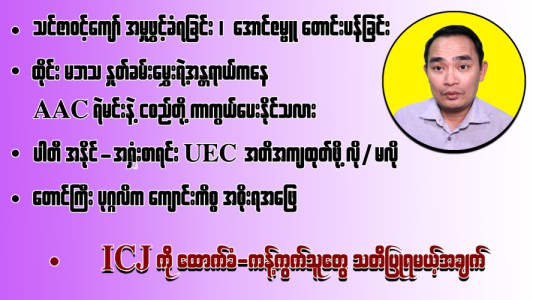ဒေါ်သီတာယုမွန်ရဲ့ခင်ပွန်းဟောင်းကို PDF တွေ ဖမ်းဆီးခြင်းနောက်ကွယ်၊ ချင်းဝန်ကြီးချုပ် အပါအဝင် လူ (၅၀၀) ထက်မနည်းကို ဟားခါး PDF ခြိမ်းခြောက်၊ ကော်သူလေးသမ္မတ ဆိုသူ နယ်ဒါးမြကို ငပေါကြီးအဖြစ် ပုံဖော်လိုက်တဲ့ စောတောနီး၊ အမေရိကန်ရဲ့ဒေါ်လာ (၁၂၁) သန်းနဲ့ နိုင်ငံ (၇၅) နိုင်ငံ၊ ICJ မှာ မြန်မာ ခုခံချေပမှု စပြီ (၁၅-၁-၂ဝ၂၆)