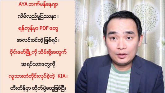 ကျောက်တော်-ရသေ့တောင်-တနိုင်း တို့ကို တပ်မတော်က လေယာဥ်နဲ့ ဗုံးကြဲ၊ တရုတ်ရဲ့ကျားဖြန့် နှိမ်နင်းရေး ရည်မှန်းချက် ကရင်ပြည်နယ်ထဲကို ဦးတည်လာတော့မလား၊ မန္တလေး မဟာအောင်မြေက KBZ ဘဏ်တစ်ခု ဓာပြတိုက်ခံရမှုနဲ့ ပြည်သူလူထုရဲ့စည်းလုံးမှု၊ ညစ်ညမ်းစာပေနဲ့ ပုံနှိပ်လောကသို့ (၁၁-၁-၂ဝ၂၅)