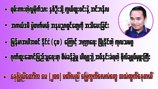 ဂုဏ်ထူးဆောင်ပြည်သူ့ရေးရာ စီမံခန့်ခွဲမှု ပါရဂူဘွဲ့ အပ်နှင်းခံရတဲ့ ဗိုလ်ချုပ်မှူးကြီး၊ ရမ်းကားတဲ့လူမိုက်သား နှစ်ဦးသို့ ကွယ်ထူးဝင်းနဲ့ အင်ဘန်လ၊ မြန်မာအပါအဝင် နိုင်ငံ(၄၀) ကြောင့် ဘဏ္ဍာရေး ပြိုနိုင်တဲ့ ကုလသမဂ္ဂ၊ အကယ်ဒမီ ပွဲတက်မယ့် အနုပညာရှင်တွေကို အသိပေးခြင်း၊ နေပြည်တော်က ပေ (၂၀၀) ပတ်လည် မြေကွက်လေလံတွေ အသံထွက်နေတယ်။ (၅-၂-၂ဝ၂၆)