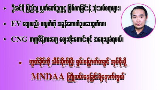 ဦးခင်ရီ ပြည်သူ့လွှတ်တော်ဥက္ကဋ္ဌ ဖြစ်လာခြင်းနဲ့ သုံးသပ်စရာများ၊ CNG တက္ကစီနဲ့ကားတွေ ဈေးတိုးတောင်းရင် အရေးယူခံရမယ်၊ EV တွေလည်း မလွတ်တဲ့ အခွန်ကောက်ဥပဒေထွက်လာ၊ ကွတ်ခိုင်ကို သိမ်းပိုက်ပြီး ရှမ်းမြောက်တခွင် အုပ်စိုးဖို့ MNDAA ကြိုးပမ်းနေခြင်းရဲ့နောက်ကွယ် (၁၆.၃.၂ဝ၂၆)
