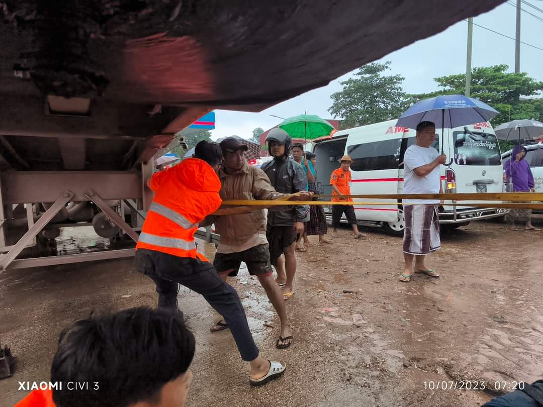 “Probox တကၠစီေပၚမွာလိုက္ပါလာတဲ့ အသက္(၂)ႏွစ္အ႐ြယ္ကေလးငယ္မိန္းကေလးတစ္ဦးရယ္။ မိခင္ျဖစ္တဲ့သူရယ္။ ဖြားေအျဖစ္သူတို႔ကေတာ့ ေနရာမွာတင္ပြဲခ်င္းၿပီးဆုံးတယ္။ ေခါင္းခန္းထဲမွာလဲ အမ်ိဳးသမီးတစ္ေယာက္ညႇပ္ေနတာနဲ႔ ဆြဲထုတ္လိုက္ေတာ့။ အဲဒီအမ်ိဳးသမီးက ဘယ္ဘက္လက္ေမာင္းက်ိဳးတာေၾကာင့္ ေဆး႐ုံပို႔လိုက္တဲ့အခ်ိန္ နာရီဝက္အၾကာမွာပဲ ေဆး႐ုံမွာဆုံးသြားပါတယ္” ဟု ၎က ဆက္လက္ေျပာသည္။
