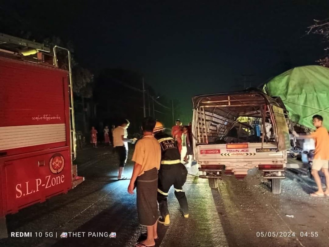 “Light Truck ကားက ထမင္းဆိုင္ကလူေတြ ဒညင္းကုန္းကို ေဈးသြားႀကိဳတာ။ အဲဒီမွာ ေကြ႕ေလးျဖစ္ေနေတာ့ ေမွာင္ကလည္း ေမွာင္ေနတာနဲ႔ အရွိန္ပါၿပီး ကုန္ကားကို ဝင္တိုက္မိတာ။ မျမင္လို႔ဝင္တိုက္မိတယ္လို႔ေတာ့ ယူဆ ရပါတယ္” ဟု ေသြးဒါနမ်ိဳးဆက္လူမႈကူညီေရးအသင္းမွ တာဝန္ရွိသူတစ္ဦးက NP News ကို ေျပာသည္။