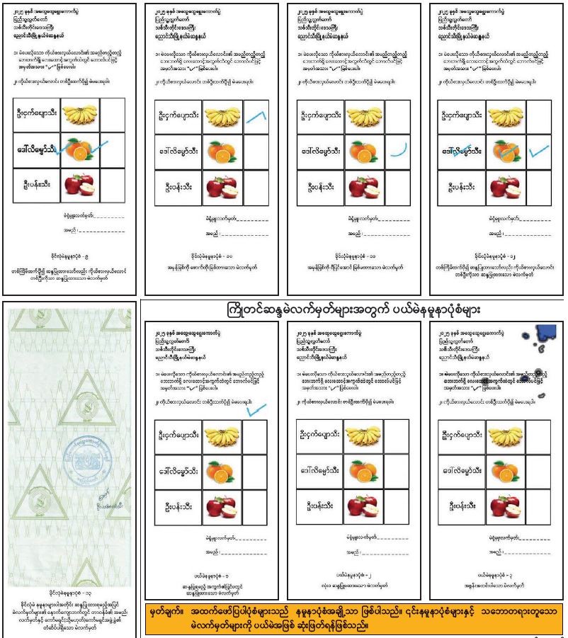 ေဘာလ္ပင္ျဖင့္ အမွန္ျခစ္ (✓) အမွတ္အသား ေရးျခစ္၍ ဆႏၵျပဳရမည့္ ႀကိဳတင္ဆႏၵမဲလက္မွတ္မ်ားအတြက္ ခိုင္လုံမဲနမူနာပုံစံမ်ားႏွင့္ ပယ္မဲနမူနာပုံစံ မ်ားကိုလည္း (UEC)က ထုတ္ျပန္အသိေပး ေၾကညာထားေၾကာင္း သိရသည္။
