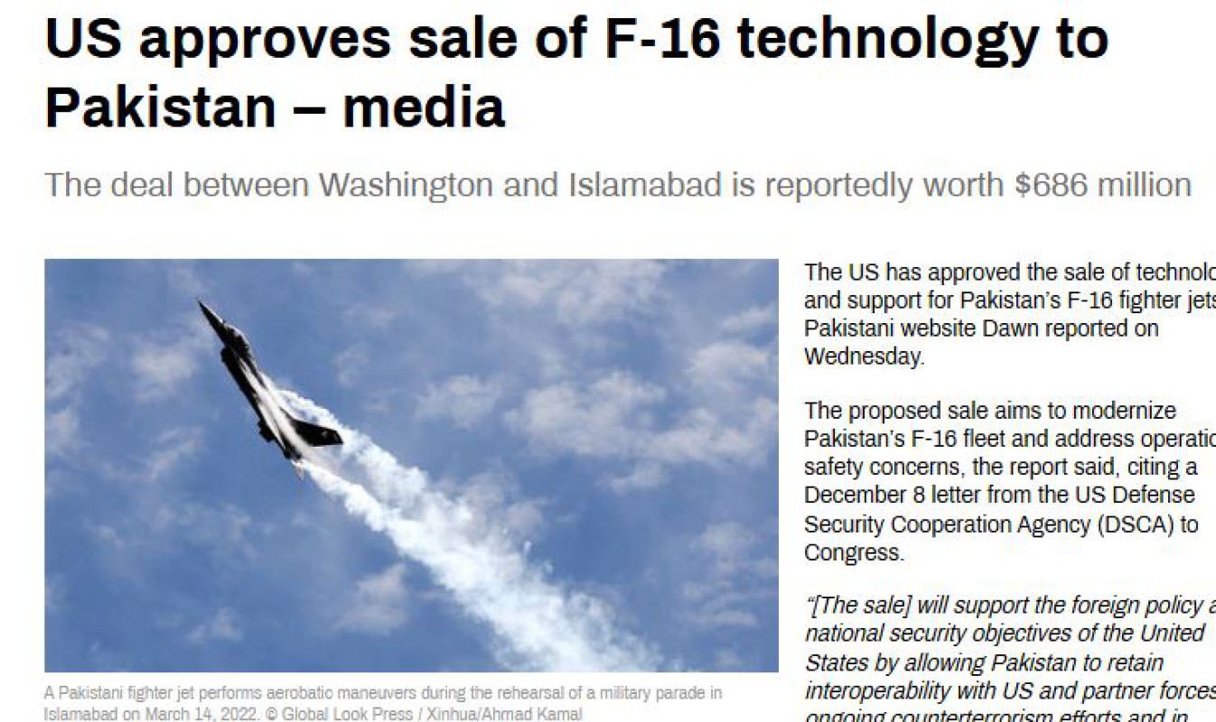ပါကစ္စတန်နိုင်ငံရဲ့ F-16 တိုက်လေယာဉ်တွေအတွက် နည်းပညာနဲ့အထောက်အကူပြုပစ္စည်းတွေ ရောင်းချပေးဖို့ အမေရိကန်က အတည်ပြုလိုက်ပြီဖြစ်တယ်လို့ ပါကစ္စတန်အစိုးရက ပြောကြားခဲ့ပါတယ်။ အဆိုပြုထားတဲ့ ရောင်းချမှုဟာ ပါကစ္စတန်ရဲ့ F-16 တပ်ဖွဲ့ကို ခေတ်မီအောင်ပြုလုပ်ဖို့နဲ့ လည်ပတ်မှုဘေးကင်းရေးဆိုင်ရာ စိုးရိမ်မှု တွေကိုဖြေရှင်းဖို့ ရည်ရွယ်ထားတယ်လို့ အမေရိကန်ကာကွယ်ရေးလုံခြုံရေးပူးပေါင်းဆောင်ရွက်မှုအေဂျင်စီ (DSCA) က ထုတ်ပြန်ပြောကြားခဲ့ပါတယ်။