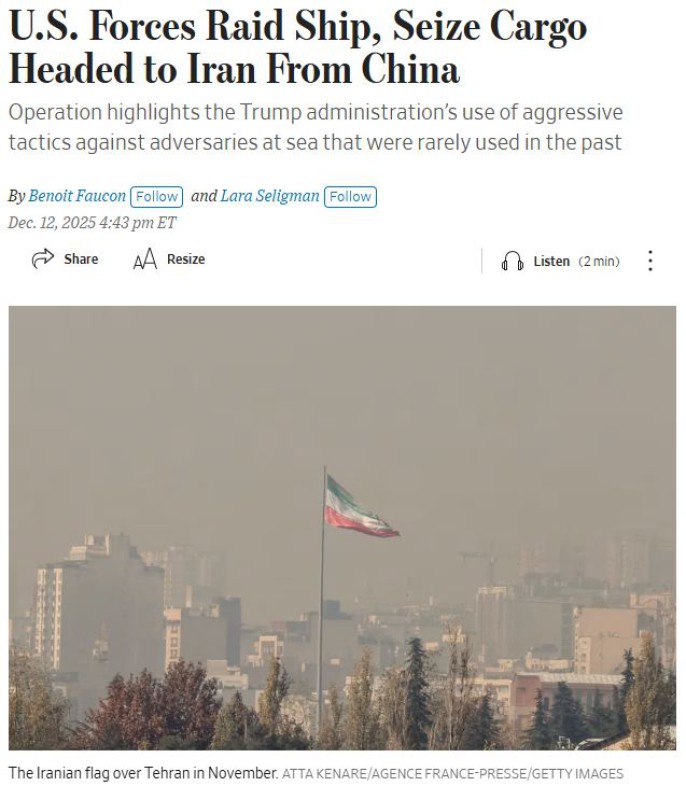 အိန္ဒိယသမုဒ္ဒရာအတွင်း လှုပ်ရှားနေတဲ့ အမေရိကန်အထူးစစ်ဆင်ရေးအဖွဲ့ဟာ တရုတ်မှ ထွက်ခွာလာပြီး အီရန် နိုင်ငံသိူ့ ဦးတည်ခုတ်မောင်းလာတဲ့ သင်္ဘောတစ်စင်းကို ပြီးခဲ့တဲ့လမှာ ဝင်ရောက်စီးနင်းခဲ့ပြီး စစ်ရေးနဲ့သက်ဆိုင် တဲ့ ပစ္စည်းများကို သိမ်းဆည်းရမိခဲ့ကြောင်း အမေရိကန်အရာရှိများကို ကိုးကားပြီး ဝေါလ်စထရိဂျာနယ်က ရေး သားတယ်လို့ ရိုက်တာသတင်းအေဂျင်စီ ၂ဝ၂၅ ခုနှစ် ဒီဇင်ဘာလ ၁၃ ရက်က ဖော်ပြပါတယ်။