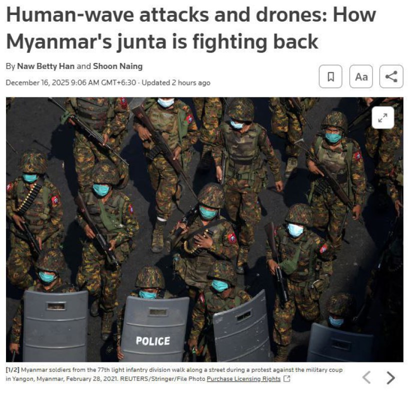 ရှေ့မတိုး နောက်မဆုတ် အခြေအနေနဲ့ အရေးနိမ့်မှုများအပြီးမှာ မြန်မာအစိုးရဟာ စစ်မှုထမ်းခြင်းနဲ့ ဒရုန်း တပ်ဖွဲ့များကို အသုံးပြုတဲ့ စစ်နည်းဗျူဟာကို ပြန်လည်ပုံဖော်လာတယ်လို့ “ရိုက်တာသတင်းအေဂျင်စီ” (16 December 2025) က ရေးပါတယ်။