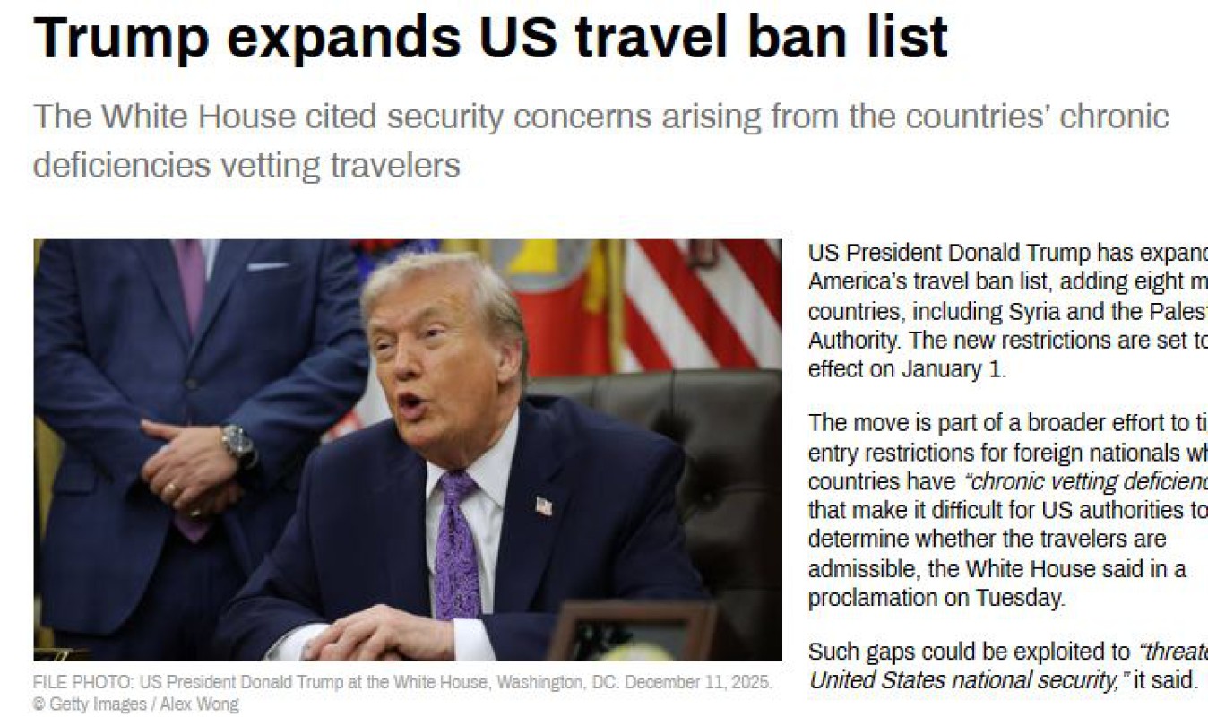 အေမရိကန္၏ ခရီးသြားလာမႈပိတ္ပင္မႈစာရင္းကို အေမရိကန္သမၼတေဒၚနယ္ထရမ့္က ထပ္မံခ်ဲ႕ထြင္ခဲ့ၿပီး ဆီးရီးယားႏွင့္ ပါလက္စတိုင္းအာဏာပိုင္အဖြဲ႕တို႔အပါအဝင္ ေနာက္ထပ္ႏိုင္ငံ(၈)ႏိုင္ငံကို အဆိုပါစာရင္းတြင္ ထည့္သြင္းခဲ့ေၾကာင္းသိရသည္။ေဒၚနယ္ထရမ့္က ထုတ္ျပန္ခဲ့ေသာ ကန႔္သတ္ခ်က္အသစ္မ်ားသည္ လာမည့္(၂၀၂၆)ခုႏွစ္ ဇန္နဝါရီလ(၁)ရက္တြင္ စတင္အသက္ဝင္မည္ျဖစ္ေၾကာင္းလည္း သိရသည္။