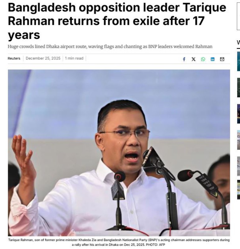 ဘဂၤလားေဒ့ရွ္အတိုက္အခံပါတီ(BNP)ေခါင္းေဆာင္တစ္ဦးျဖစ္သည့္ တာရီေကြရာမန္သည္ ျပည္ေျပးအျဖစ္ (၁၇)ႏွစ္ၾကာေနထိုင္ခဲ့ၿပီးေနာက္ ဒီဇင္ဘာလ (၂၅)ရက္တြင္ မိခင္ႏိုင္ငံသို႔ ျပန္လာခဲ့ ေၾကာင္းသိရသည္။