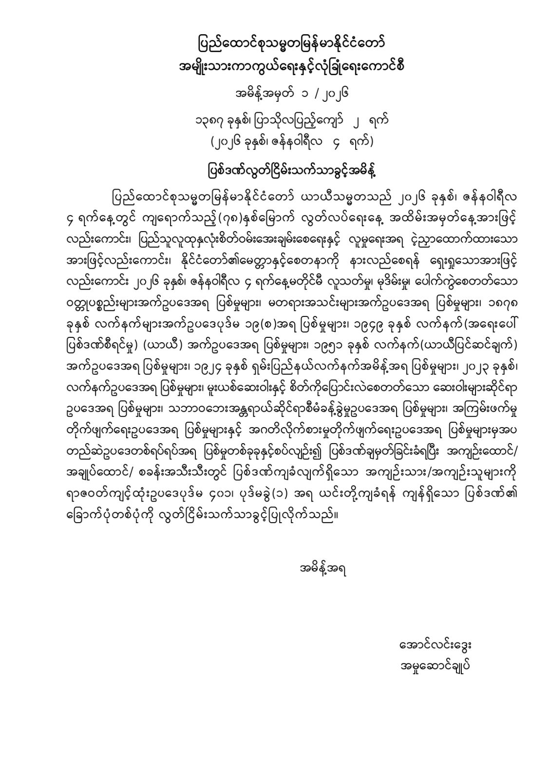 ထို့ပြင် နိုင်ငံခြားသား အကျဉ်းသား၊ အကျဉ်းသူ (၅၂)ဦးကိုလည်း ပြစ်ဒဏ်လျှော့ပေါ့ပြီး လွတ်ငြိမ်းချမ်းသာခွင့်ပြု၍ ပြည်နှင်ဒဏ်ပေးအပ်လိုက်ကြောင်း သိရသည်။