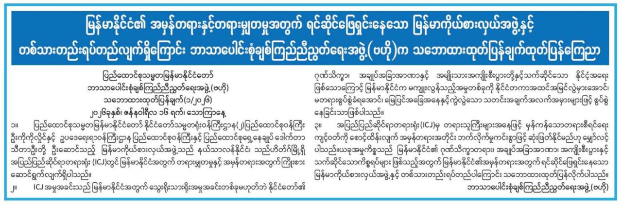 ICJ အမှုအခင်းသည် မြန်မာနိုင်ငံအတွက် သွေးရိုးသားရိုးအမှုအခင်းတစ်ခုမဟုတ်ပဲ နိုင်ငံတော်၏ ဂုဏ်သိက္ခာ၊ အချုပ်အခြာအာဏာနှင့် အမျိုးသားအကျိုးစီးပွားတို့နှင့်သက်ဆိုင်သော နိုင်ငံ့အရေး ဖြစ်သောကြောင့် မြန်မာနိုင်ငံက မကျူးလွန်သည့်အမှုတစ်ခုကို နိုင်ငံတကာ အထင်အမြင်လွဲမှားအောင်၊ မတရားစွပ်စွဲခံရအောင်၊ မြေပြင်အခြေအနေနှင့်ကွဲလွဲသော သတင်းအချက်အလက်အမှားများဖြင့် စွပ်စွဲ နေခြင်းသာဖြစ်ကြောင်း ထုတ်ပြန်ချက်တွင် ပါရှိသည်။