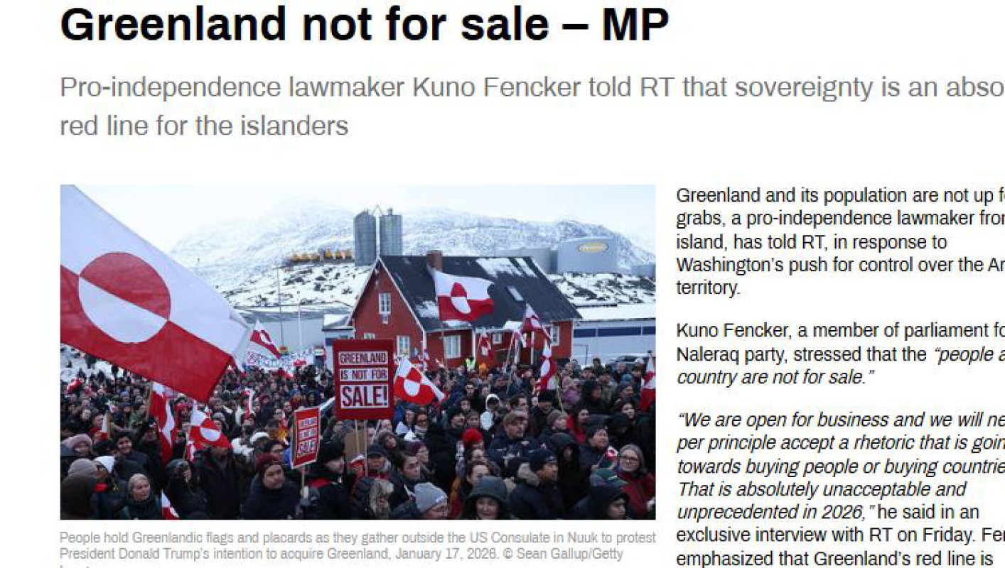 ဂရင်းလန်းကျွန်းက ရောင်းဖို့မဟုတ်ကြောင်း နဲ့ ကျွန်းနဲ့၎င်းရဲ့လူဦးရေတွေက သိမ်းပိုက်ပြီးပိုင်ဆိုင်လို့ရတဲ့အရာ တစ်ခု မဟုတ်ဘူးလို့ ဂရင်းလန်းကျွန်းလွှတ်တော်အမတ်တစ်ဦးက ထုတ်ပြန်ပြောကြားခဲ့ပါတယ်။ ဂရင်းလန်းကျွန်း ကို သိမ်းပိုက်လိုနေတဲ့ အမေရိကန်ရဲ့တွန်းအားပေးမှုတွေကိုတုံ့ပြန်တဲ့အနေနဲ့ ဂရင်းလန်းကျွန်း လွှတ်တော်အမတ် က ယခုလိုပြောဆိုခဲ့တာဖြစ်တယ်လို့လည်း သိရပါတယ်။