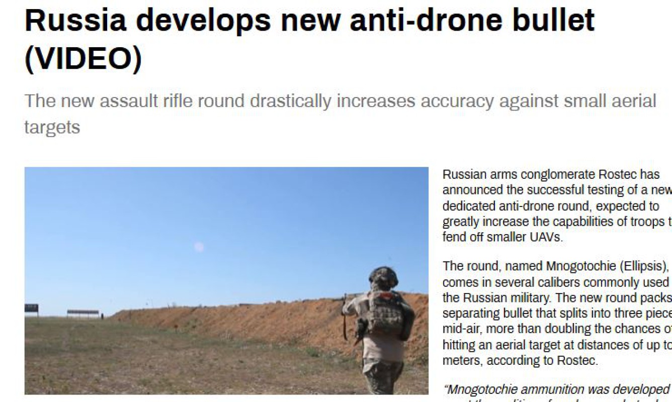 ဒရုန်းတိုက်ဖျက်ရေးကျည်ဆန်အသစ်တစ်ခုကို အောင်မြင်စွာ စမ်းသပ်နိုင်ခဲ့တယ်လို့ ရုရှားစစ်လက်နက်ပစ္စည်း ကုမ္ပဏီကြီး Rostec က ထုတ်ပြန်ကြေညာခဲ့ပါတယ်။ ဒီကျည်ဆန်အသစ်ဟာ သေးငယ်တဲ့ဒရုန်းတွေကို ခုခံ ကာကွယ်မယ့် ရုရှားတပ်ဖွဲ့တွေရဲ့စွမ်းဆောင်ရည်တွေကို သိသိသာသာမြှင့်တင်ပေးနိုင်ဖို့ မျှော်လင့််မိတယ်လို့လည်း Rostec ကုမ္ပဏီက ထုတ်ပြန်ပြောကြားခဲ့ပါတယ်။ အဲဒီကျည်ဆန်ကို Mnogotochie (Ellipsis)လို့ အမည်ပေးထား ပြီး လေထဲမှာအပိုင်းသုံးပိုင်းခွဲထုတ်နိုင်စွမ်းရှိကာ မီတာ(၃၀၀)အကွာအဝေးမှာရှိတဲ့ လေကြောင်းပစ်မှတ်အပေါ် ထိမှန်နိုင်ခြေကို နှစ်ဆကျော်တိုးစေမှာဖြစ်တယ်လို့လည်း Rostec က ပြောကြားခဲ့ပါတယ်။ Rostec က “ Mnogotochie ကျည်ဆန်ကို ခေတ်မီတိုက်ပွဲတွေရဲ့ လက်တွေ့အခြေအနေတွေနဲ့ ကိုက်ညီစေဖို့ တီထွင်ခဲ့တာဖြစ်ပါ တယ်။ ဘာလို့လဲဆိုတော့ သေးငယ်တဲ့ဒရုန်းတွေက စစ်သားတွေအတွက် အဓိကခြိမ်းခြောက်မှုတွေထဲက တစ်ခုဖြစ်လာလို့ပဲဖြစ်ပါတယ်။ သေးငယ်တဲ့လက်နက်တွေက ဒရုန်းတွေကို ခုခံကာကွယ်ဖို့ ထိရောက်တဲ့နည်းလမ်း တစ်ခုဖြစ်တယ်ဆိုတာကို အတွေ့အကြုံတွေက ပြသနေပါတယ်” လို့ ပြောခဲ့ပါတယ်။