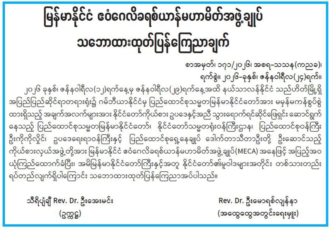 ပြည်ထောင်စုသမ္မတမြန်မာနိုင်ငံတော်၊ နိုင်ငံတော်သမ္မတရုံးဝန်ကြီးဌာန၊ ပြည်ထောင်စုဝန်ကြီး ဦးကိုကိုလှိုင်၊ ဥပဒေရေးရာဝန်ကြီးနှင့် ပြည်ထောင်စုရှေ့နေချုပ် ဒေါက်တာသီတာဦးတို့ ဦးဆောင်သည့် ကိုယ်စားလှယ်အဖွဲ့တို့အား မြန်မာနိုင်ငံ ဧဝံဂေလိခရစ်ယာန်မဟာ မိတ်အဖွဲ့ချုပ် (MECA) အနေဖြင့် အပြည့်အဝ ယုံကြည်ထောက်ခံပြီး၊ အမိမြန်မာနိုင်ငံတော်ကြီးနှင့်အတူ နိုင်ငံတော်၏မူဝါဒများအတိုင်း တစ်သားတည်း ရပ်တည်လျက် ရှိပါကြောင်း သဘောထားထုတ်ပြန်ထားသည်။