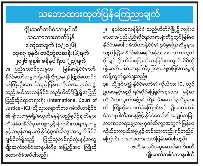 ဇန်နဝါရီလ(၁၂)ရက်နေ့မှ ဇန်နဝါရီလ(၂၉)ရက်နေ့အထိ နယ်သာလန်နိုင်ငံ သည်ဟိတ်မြို့ရှိအပြည်ပြည်ဆိုင်ရာတရားရုံး၌ ဂမ်ဘီယာနိုင်ငံမှ ပြည်ထောင်စုသမ္မတမြန်မာနိုင်ငံတော်အား မမှန်မကန်စွပ်စွဲ ထားရှိသည့် အချက်အလက်များအား နိုင်ငံတော်ကိုယ်စား ဥပဒေနှင့်အညီ သွားရောက်ရင်ဆိုင်ဖြေရှင်း ဆောင်ရွက်နေရကြောင်း ထုတ်ပြန်ချက်တွင် ပါရှိသည်။