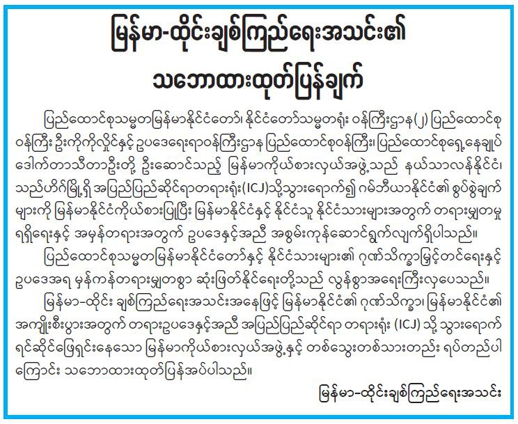 အလားတူ မြန်မာ-ထိုင်းချစ်ကြည်ရေးအသင်းမှ မြန်မာနိုင်ငံ၏ အကျိုးစီးပွားနှင့် ဂုဏ်သိက္ခာကို ကာကွယ်ရန် ICJ တွင် ရင်ဆိုင်ဖြေရှင်း နေသည့် မြန်မာကိုယ်စားလှယ်အဖွဲ့နှင့် တစ်သွေးတစ်သားတည်း ရပ်တည်ကြောင်းလည်း သဘောထားထုတ်ပြန်ထားသည်။