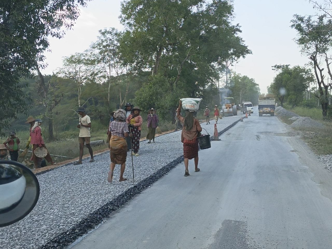 " ကျောင်းကုန်း နဲ့ ကံကလေးနဲ့ကြားမှာ လည်း ကတ္တရာထပ်ပိုးလွှာခင်းတဲ့လုပ်ငန်းတွေ လုပ် နေတာတွေ့ရမှာပါ။ အပိုင်းလိုက်လုပ်နေတာ။ အဲဒါ တွေကလည်း ကံကလေးကနေ ဒါးကကြားထဲမှာဆို လည်း (၃)နေရာလောက် မူလ (၁၈)ပေရှိတဲ့နေရာ တွေကို (၂၄)ပေရှိအောင် ချဲ့နေတာတွေရှိတာပေါ့။ အဲဒါတွေကတော့ ဖေဖော်ဝါရီ လကုန်လောက်မှာ ပြီး အောင် ဆောင်ရွက်သွားဖို့ စီမံဆောင်ရွက်နေတယ်။ ဒါးကကျော်ပြီးသွားရင် ပုသိမ်ရောက်ခါနီး ကတ္တရာ ထပ်ပိုးလွှာ ထပ်ခင်းတယ်။ တာဘောင်ချဲ့တာတွေက ရာနှုန်းပြည့်ပြီးစီးနေပါပြီ။ မိုင်တိုင်(၁၀၂)၊ (၁၀၃) လောက်မှာ ဆောင်ရွက်ထားတာ။ မိုင်တိုင် (၁၀၅) လောက်မှာလည်း ပေ(၃၀) အကျယ် ကွန်ကရစ် ခင်း တဲ့လုပ်ငန်း (၃)ဖာလုံဆောင်ရွက်နေတယ်။ အပိုင်း လိုက် အပိုင်းလိုက်အဖွဲ့တွေနဲ့ အင်နဲ့အားနဲ့တော့ ဆောင်ရွက်နေပါတယ်" ဟု ပြောသည်။