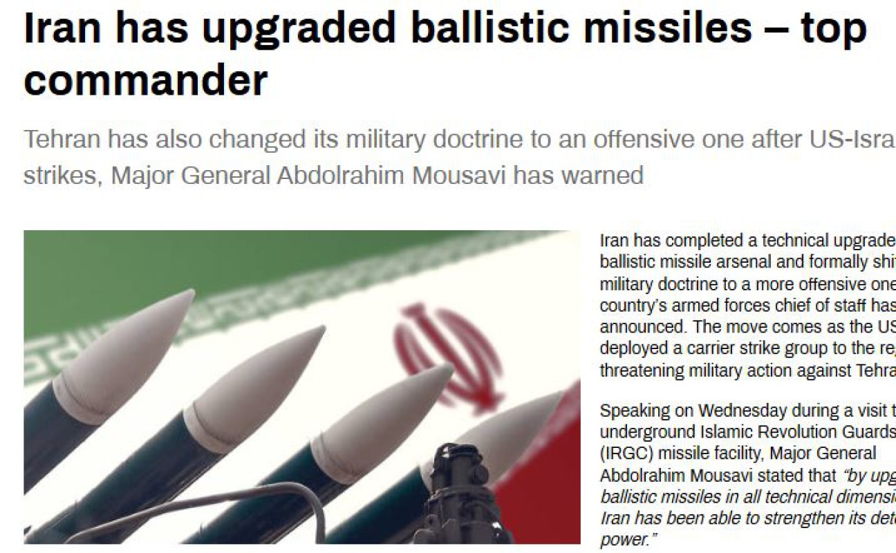 Abdolrahim Mousavi ဟာ အီရန်စစ်တပ်ရဲ့မြေအောက်မှာရှိတဲ့ဒုံးကျည်အဆောက်အဦးတစ်ခုကို သွားရောက် လည်ပတ်စဉ်အချိန်အတွင်း ယခုလိုထုတ်ဖော်ပြောဆိုခဲ့တာလည်းဖြစ်ပါတယ်။ Abdolrahim Mousavi က “နည်းပညာပိုင်းဆိုင်ရာရှုထောင့်တွေမှာ ပဲ့ထိန်းဒုံးကျည်တွေကို အဆင့်မြှင့်တင်တာက အီရန်ရဲ့ ဟန့်တားနိုင်စွမ်း တွေကို ပိုပြီးအားကောင်းလာစေပါလိမ့်မယ်” လို့ ပြောခဲ့ပါတယ်။