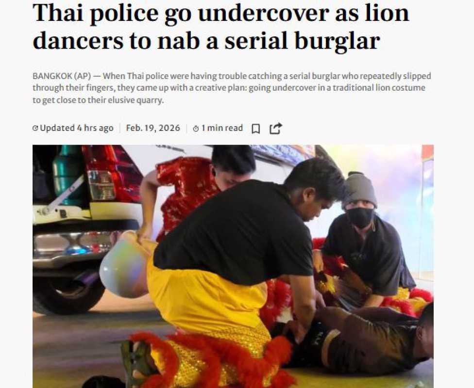 ထိုင်းမှာ ရဲတပ်ဖွဲ့က တရုတ်ခြင်္သေ့အကသမား ဟန်ဆောင်ပြီး သံသယရှိ ဖောက်ထွင်း ခိုးယူသူကို ဖမ်းဆီး